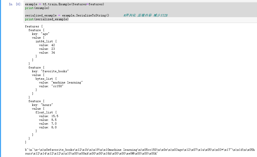 # tfrecord 文件格式# -> tf.train.Example# -> tf.train.Features -> {"key": tf.train.Feature}# -> tf.train.Feature -> tf.train.ByteList/FloatList/Int64Listfavorite_books = [name.encode('utf-8') for name in ["machine learning", "cc150"]]favorite_books_bytelist = tf.train.BytesList(value = favorite_books)print(favorite_books_bytelist)hours_floatlist = tf.train.FloatList(value = [15.5, 9.5, 7.0, 8.0])print(hours_floatlist)age_int64list = tf.train.Int64List(value = [42])print(age_int64list)features = tf.train.Features(feature = {"favorite_books": tf.train.Feature(bytes_list = favorite_books_bytelist),"hours": tf.train.Feature(float_list = hours_floatlist),"age": tf.train.Feature(int64_list = age_int64list),})print(features)