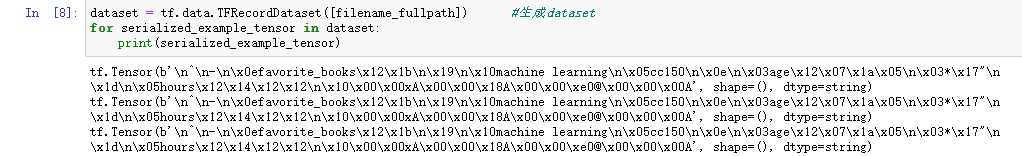 # 读取文件dataset = tf.data.TFRecordDataset([filename_fullpath]) #生成datasetfor serialized_example_tensor in dataset:print(serialized_example_tensor)