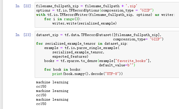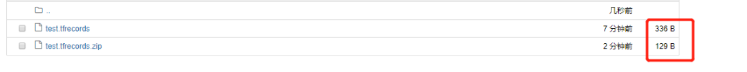 # 存成压缩文件filename_fullpath_zip = filename_fullpath + '.zip'options = tf.io.TFRecordOptions(compression_type = 'GZIP')with tf.io.TFRecordWriter(filename_fullpath_zip , options) as writer:for i in range(3):writer.write(serialized_example)