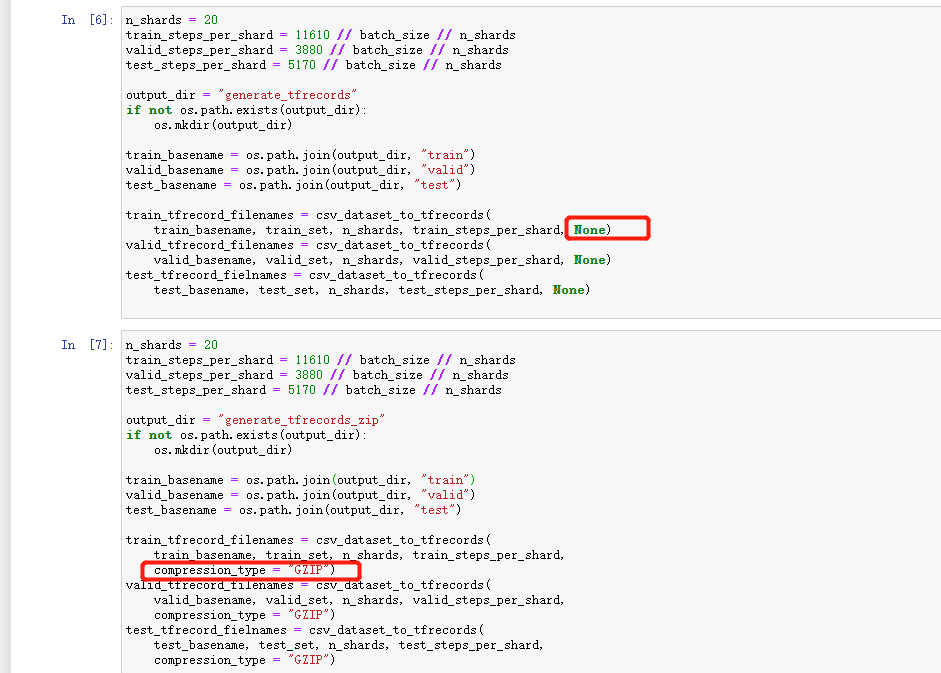 # 生成压缩文件n_shards = 20train_steps_per_shard = 11610 // batch_size // n_shardsvalid_steps_per_shard = 3880 // batch_size // n_shardstest_steps_per_shard = 5170 // batch_size // n_shardsoutput_dir = "generate_tfrecords_zip"if not os.path.exists(output_dir):os.mkdir(output_dir)train_basename = os.path.join(output_dir,'train')valid_basename = os.path.join(output_dir,'valid')test_basename = os.path.join(output_dir,'test')train_tfrecord_filenmaes = csv_dataset_to_tfrecords(train_basename,train_set,n_shards,train_steps_per_shard,compression_type="GZIP")valid_tfrecord_filenames = csv_dataset_to_tfrecords(valid_basename,valid_set,n_shards,valid_steps_per_shard,compression_type="GZIP")test_tfrecord_filenames = csv_dataset_to_tfrecords(test_basename,test_set,n_shards,valid_steps_per_shard,compression_type="GZIP")