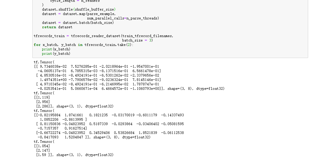 batch_size = 32train_set = csv_reader_dataset(train_filenames,batch_size=batch_size)valid_set = csv_reader_dataset(valid_filenames,batch_size=batch_size)test_set = csv_reader_dataset(test_filenames,batch_size=batch_size)