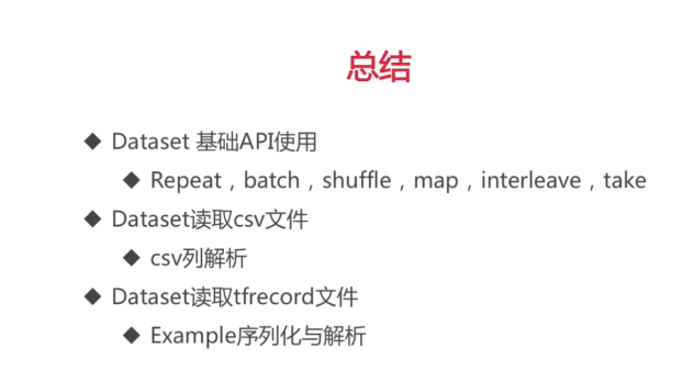 def csv_reader_dataset(filenames,n_readers=5,batch_size=32,n_parse_threads=5,shuffle_buffer_size=10000):# 1. filename -> datasetdataset = tf.data.Dataset.list_files(filenames)dataset = dataset.repeat() # 重复多少次# 文件名转换成文本内容dataset = dataset.interleave(lambda filename:tf.data.TextLineDataset(filename).skip(1),cycle_length = n_readers)dataset.shuffle(shuffle_buffer_size)# 解析dataset = dataset.map(parse_csv_line,num_parallel_calls=n_parse_threads)dataset = dataset.batch(batch_size)return dataset