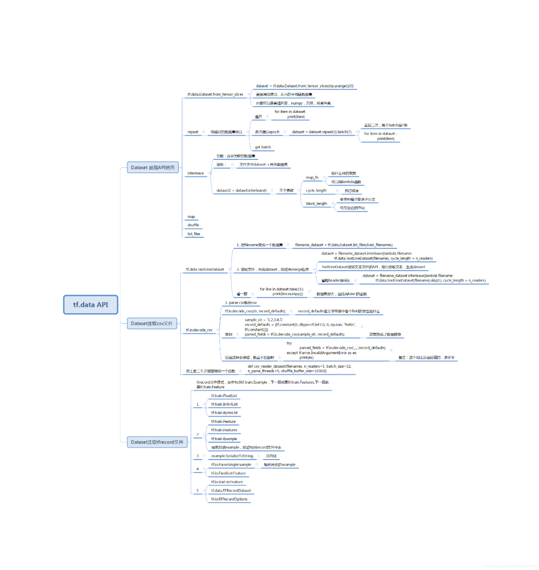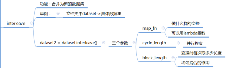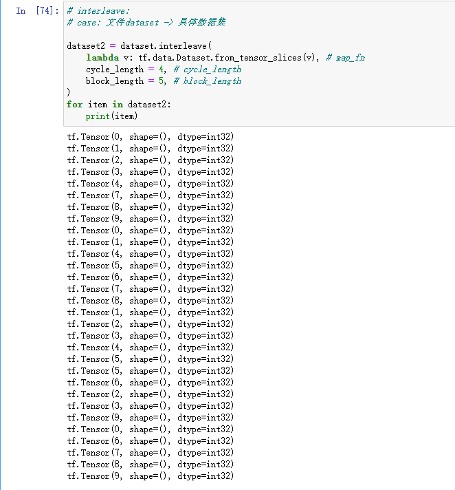 # iterleave:# case: 文件 datset -> 具体数据集dataset2 = dataset.interleave(lambda v : tf.data.Dataset.from_tensor_slices(v), # map_fn 进行何种操作cycle_length = 5, # cycle_length 并行程度block_length = 5, # block_length 均匀混合 长度)for item in dataset2:print(item)