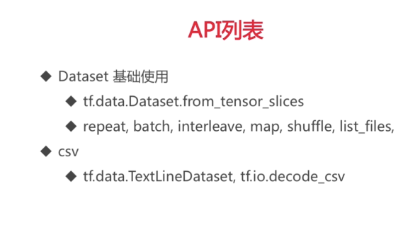 # 整体# 1. filename -> dataset# 2. read file -> dataset -> datasets -> megre# 3. parse csvdef csv_reader_dataset(filenames,n_readers=5,batch_size=32,n_parse_threads=5,shuffle_buffer_size=10000):# 1. filename -> datasetdataset = tf.data.Dataset.list_files(filenames)dataset = dataset.repeat() # 重复多少次# 文件名转换成文本内容dataset = dataset.interleave(lambda filename:tf.data.TextLineDataset(filename).skip(1),cycle_length = n_readers)dataset.shuffle(shuffle_buffer_size)# 解析dataset = dataset.map(parse_csv_line,num_parallel_calls=n_parse_threads)dataset = dataset.batch(batch_size)return dataset# 测试train_set = csv_reader_dataset(train_filenames,batch_size=3)for x_batch,y_batch in train_set.take(2):print("x:")pprint.pprint(x_batch)print("y:")pprint.pprint(y_batch)