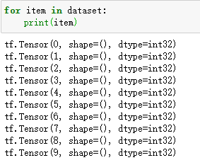 # 初始化 datasetdataset = tf.data.Dataset.from_tensor_slices(np.arange(10))print(dataset)