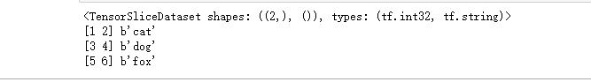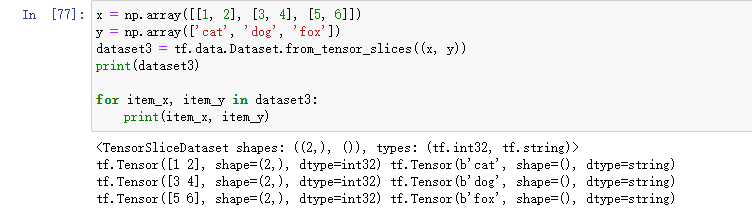 x = np.array([[1, 2], [3, 4], [5, 6]])y = np.array(['cat', 'dog', 'fox'])dataset3 = tf.data.Dataset.from_tensor_slices((x, y))print(dataset3)for item_x, item_y in dataset3:print(item_x.numpy(), item_y.numpy())