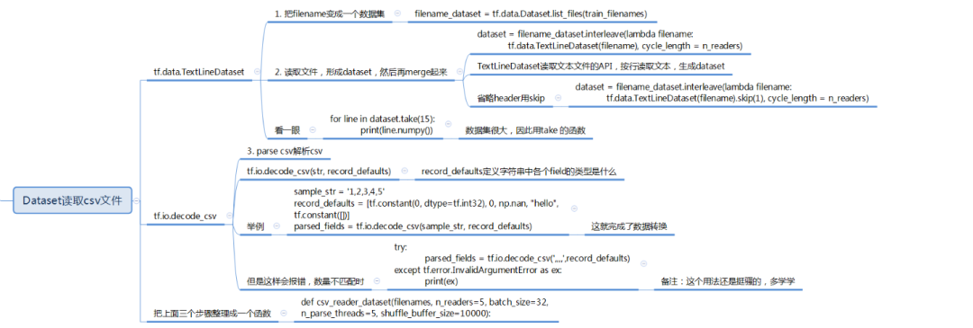 # 解析dataset 中的一行def parse_csv_line(line,n_fields=9):defs = [tf.constant(np.nan)] * n_fieldsparsed_fields = tf.io.decode_csv(line,record_defaults=defs)x = tf.stack(parsed_fields[0:-1])y = tf.stack(parsed_fields[-1:])return x,yparse_csv_line(b'-0.060214068004363165,0.7527628439249472,0.0835940301935345,-0.06250122441959183,-0.03497131082291674,-0.026442380178345683,1.0712234607868782,-1.3707331756959855,1.651',n_fields=9)