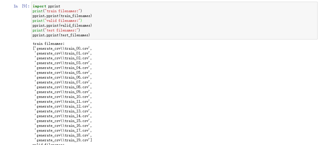 # 读取上面生成的文件# 打印文件名import pprintprint("train filenames: ")pprint.pprint(train_filenames)print("valid filenames: ")pprint.pprint(valid_filenames)print("test filenames: ")pprint.pprint(test_filenames)