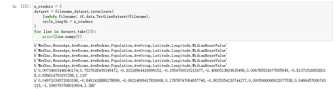 n_readers = 5 # 并行度dataset = filename_dataset.interleave(lambda filename : tf.data.TextLineDataset(filename).skip(1), # skip(1) 省略一行cycle_length = n_readers)for line in dataset.take(15):print(line.numpy(