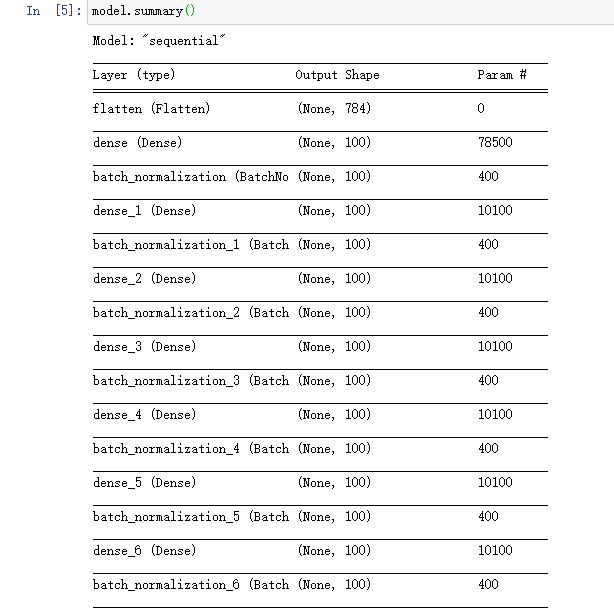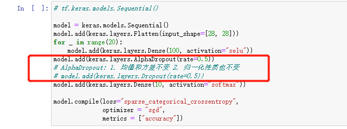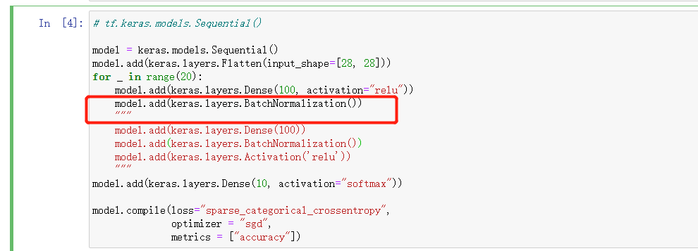 model = keras.models.Sequential()model.add(keras.layers.Flatten(input_shape=[28, 28]))for _ in range(20):model.add(keras.layers.Dense(100, activation="relu"))model.add(keras.layers.BatchNormalization())"""model.add(keras.layers.Dense(100))model.add(keras.layers.BatchNormalization())model.add(keras.layers.Activation('relu'))"""model.add(keras.layers.Dense(10, activation="softmax"))model.compile(loss="sparse_categorical_crossentropy",optimizer = "sgd",metrics = ["accuracy"])