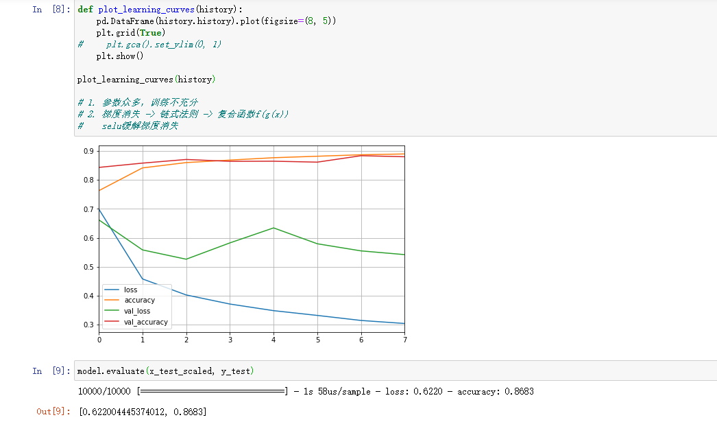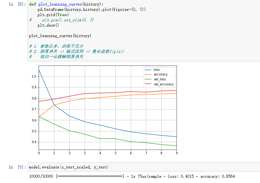训练 模型# Tensorboard, earlystopping, ModelCheckpointlogdir = os.path.join('dnn-bn-callbacks')if not os.path.exists(logdir):os.mkdir(logdir)output_model_file = os.path.join(logdir,"fashion_mnist_model_dnnbn.h5")callbacks = [keras.callbacks.TensorBoard(logdir),keras.callbacks.ModelCheckpoint(output_model_file,save_best_only = True),keras.callbacks.EarlyStopping(patience=5, min_delta=1e-3),]history = model.fit(x_train_scaled, y_train, epochs=10,validation_data=(x_valid_scaled, y_valid),callbacks = callbacks)