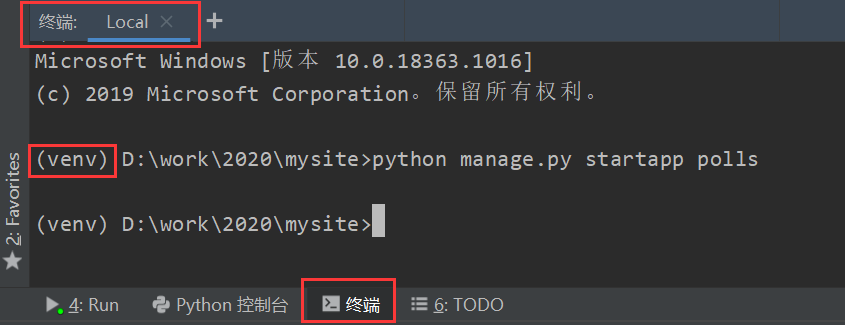 在Pycharm中,没有可以创建app的图形化按钮,需要在下方的Terminal终端中输入命令: