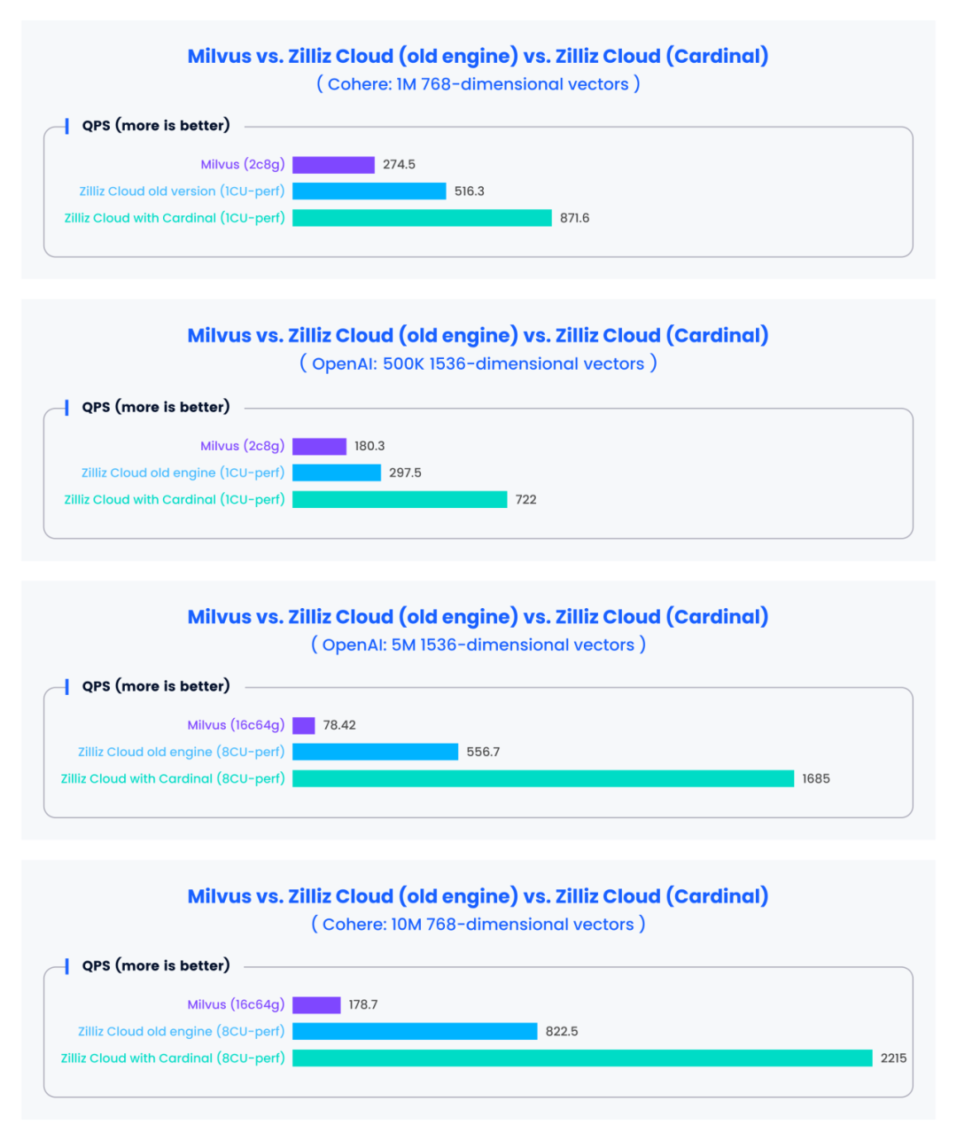 下面呈现的性能测试结果仅针对 Cardinal 引擎,不包括 Zilliz Cloud 提供的其他非索引优化(包含 Zilliz Cloud 特定优化的结果可在文章开头获取)。