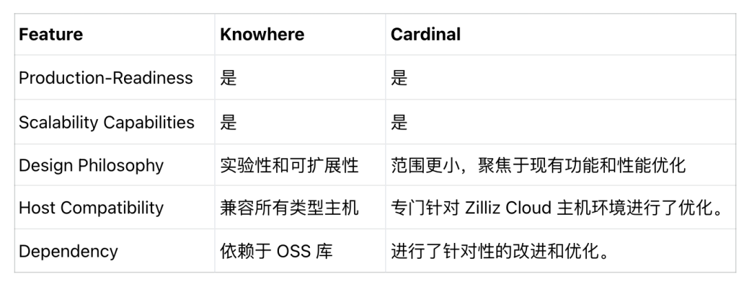 Knowhere 设计时考虑到实验性和灵活性;Cardinal 的范围更狭窄,优先考虑增强现有功能以提高速度和性能,而不是引入广泛的新功能。