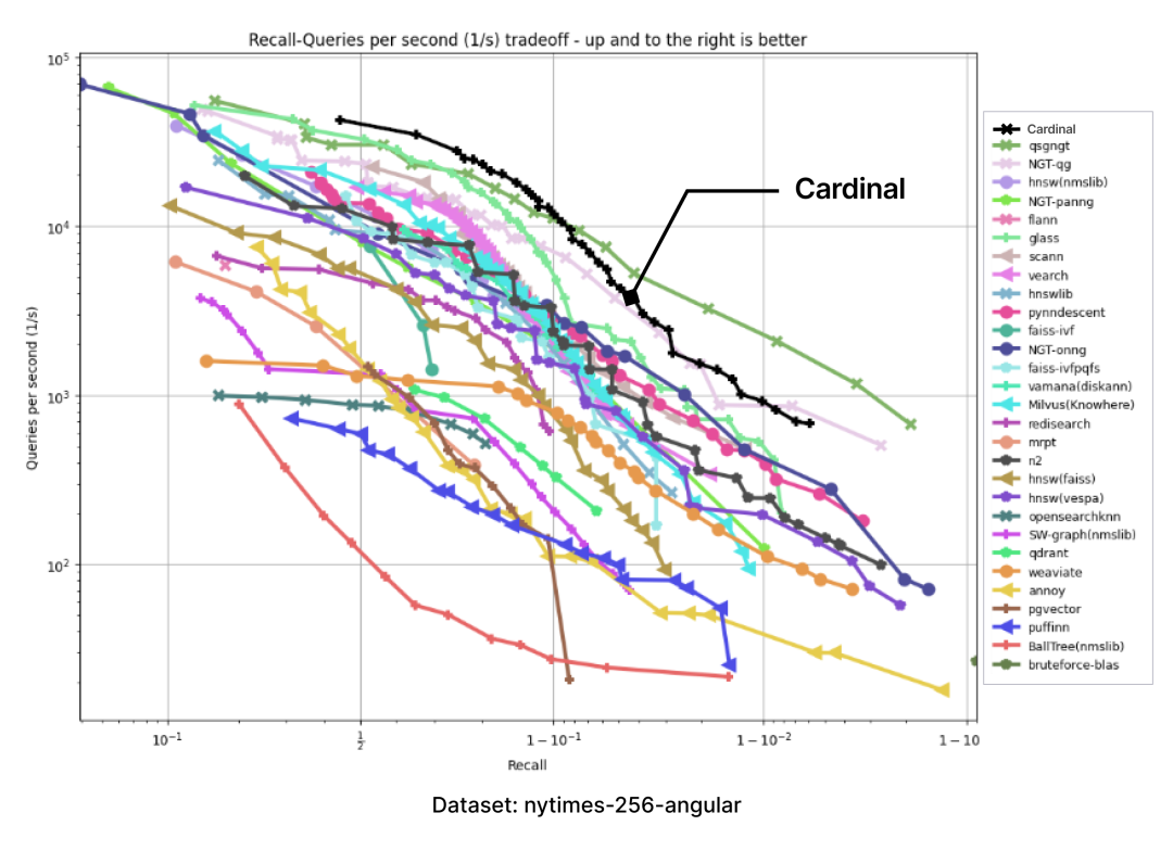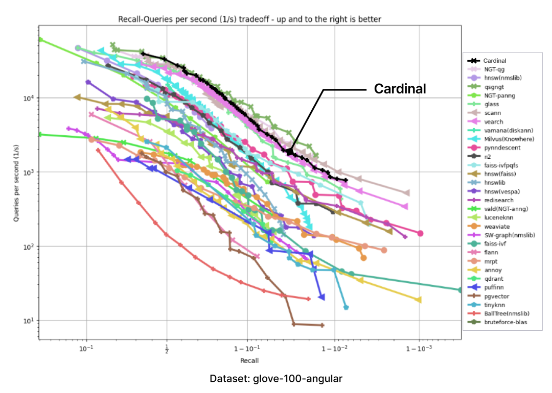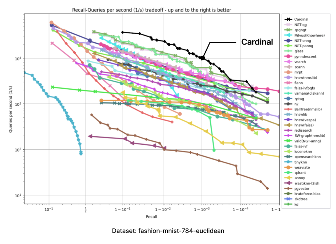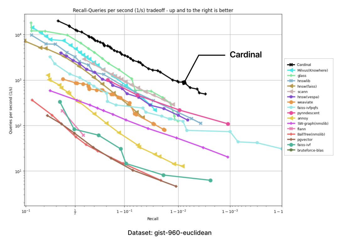 以下图表是通过 ANN-benchmark GitHub 页面上呈现的图表结果,并添加一个 Cardinal 曲线而生成的: