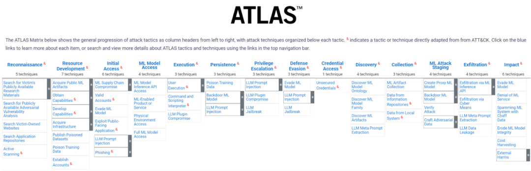 因此对微软或者其他 AI 服务提供商而言,防范 AI 技术被滥用,安全地设计、部署和使用 AI 技术从未像现在这样重要。微软也是这方面的先驱,在 2021 年即与 MITRE 以及其他厂商合作,一起推出了 AI 攻击威胁态势框架 MITRE ATLAS™(Adversarial Threat Landscape for Artificial-Intelligence Systems)框架,如下图所示,用于帮助企业识别和分析 AI/ML 技术、应用和系统的安全风险,从而进行更好的安全风险应对和安全保护。