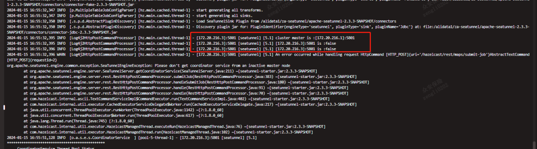 原因:2.3.3版本通过HazelcastInstance在非master节点上无法获取Master服务的相关实例;