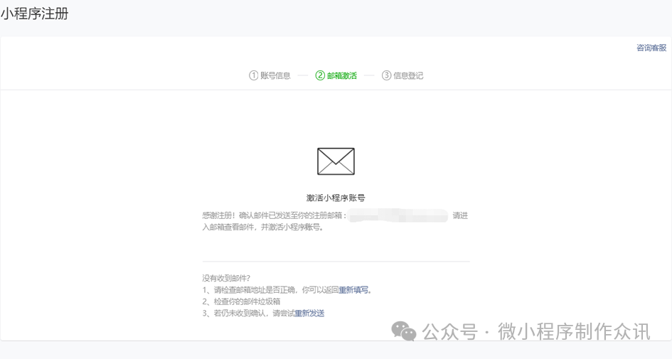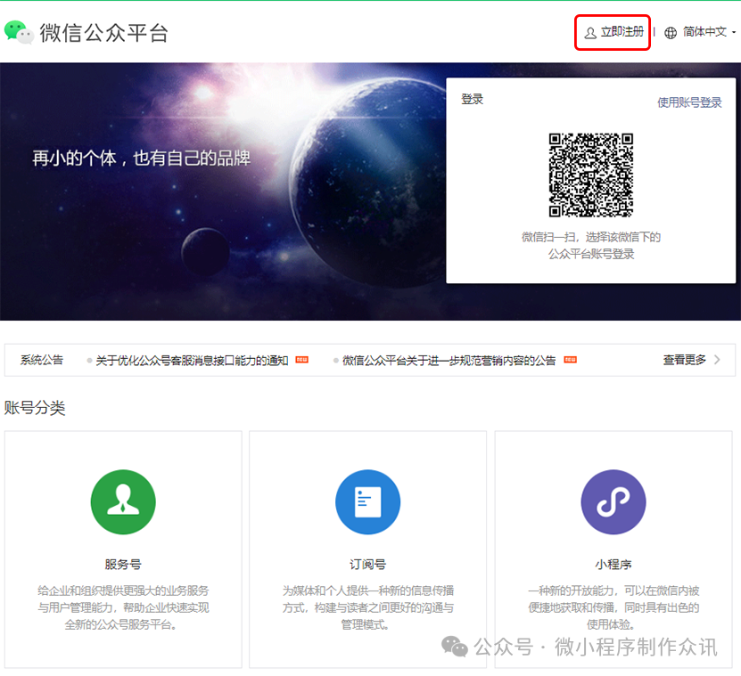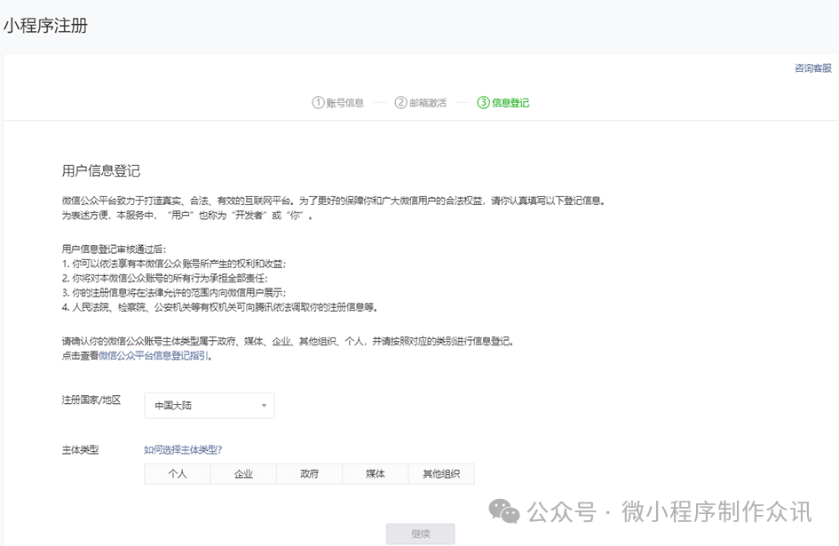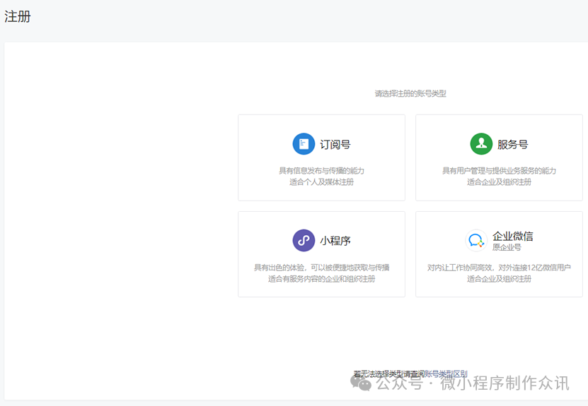 在微信公众平台官网首页(mp.weixin.qq.com)点击右上角的“立即注册”按钮。选择“小程序”,点击“查看类型区别”可查看不同类型账号的区别和优势。请填写未注册过公众平台、开放平台、企业号、未绑定个人号的邮箱。点击激活链接后,继续下一步的注册流程。请选择主体类型选择,完善主体信息和管理员信息。