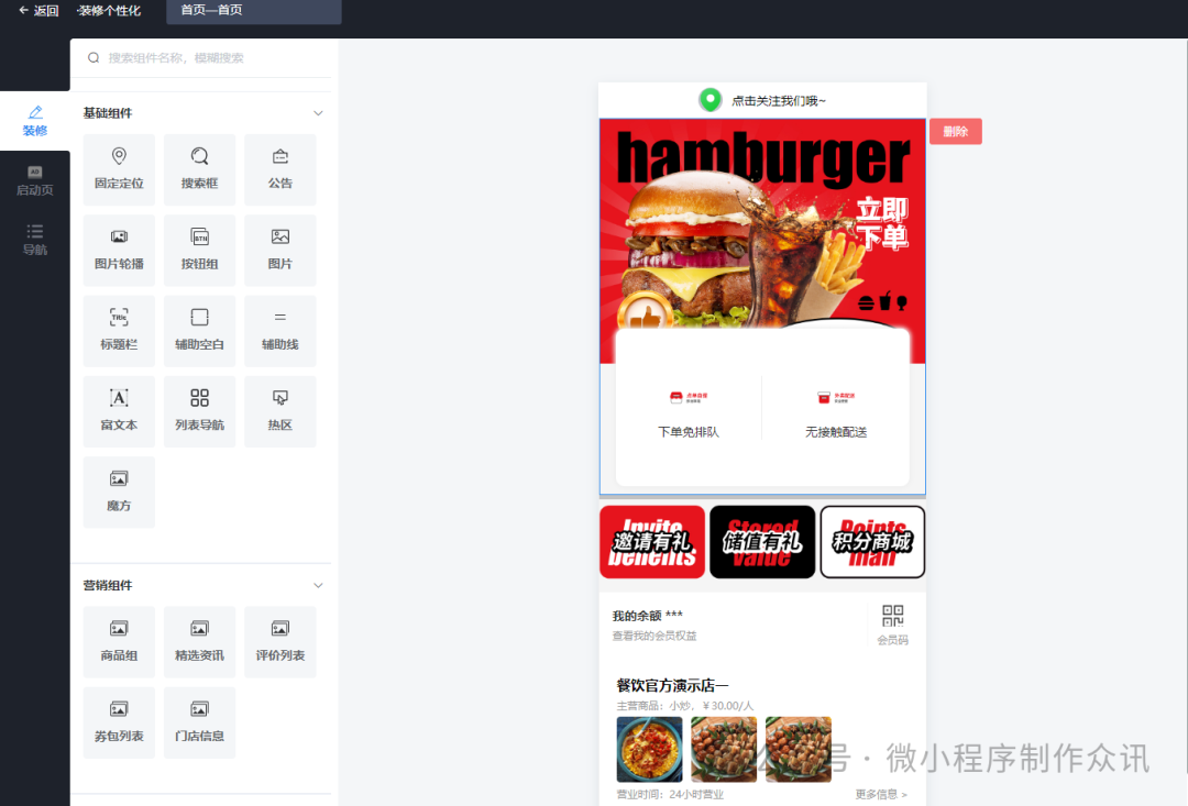 选择一个靠谱专业的扫码点单小程序制作后台,授权绑定扫码点单小程序在扫码点单小程序后台,设置小程序首页,轮播图、广告、图片、产品、活动、导航、积分、余额等。