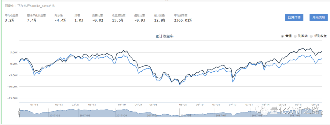 import numpy as npimport pandas as pdstart = '2017-01-01' # 回测起始时间end = '2018-01-01' # 回测结束时间universe = DynamicUniverse('ZZ500') # 证券池,支持股票、基金、期货、指数四种资产benchmark = 'ZZ500' # 策略参考标准freq = 'd' # 策略类型,'d'表示日间策略使用日线回测,'m'表示日内策略使用分钟线回测refresh_rate = 1 # 调仓频率,表示执行handle_data的时间间隔,若freq = 'd'时间间隔的单位为交易日,若freq = 'm'时间间隔为分钟# 配置账户信息,支持多资产多账户accounts = {'fantasy_account': AccountConfig(account_type='security', capital_base=10000000)}##买入卖出阈值buy_threshold = 0sell_threshold = 0def initialize(context):wvad = Signal('WVAD') #默认24天context.signal_generator = SignalGenerator(wvad)def handle_data(context):timing(context)