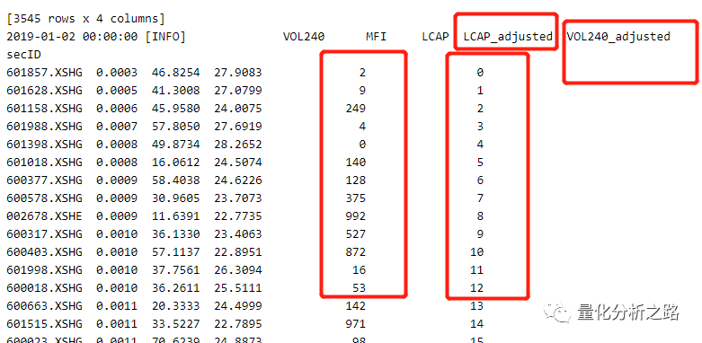 import numpy as npdef grade_stock_by_sorting(data,factor,ascending=True):'''处理单个因子'''data.sort_index(by= factor,ascending = ascending ,inplace = True)data[factor + '_adjusted'] = np.arange(len(data))log.info(data)return data
