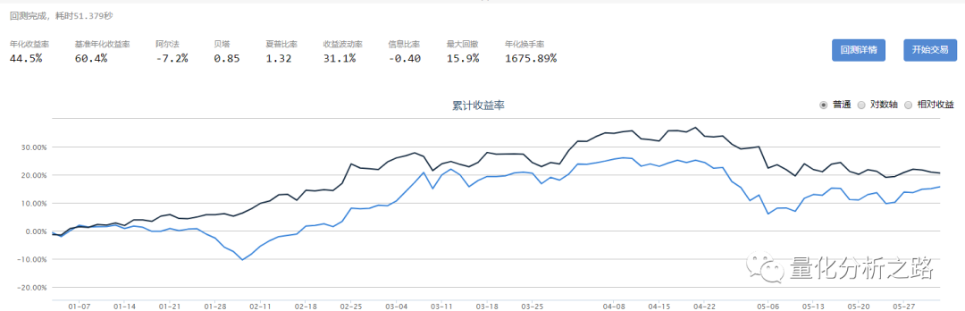 我们取出市场中得分前50的股票进行均仓买入。这只是一个简单地思路