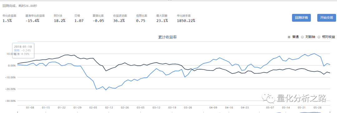 我跑了一下回测 因为数据量过大 只能回测半年左右的。分别是18年和19年前半年的 回测结果 也比较一般 。
