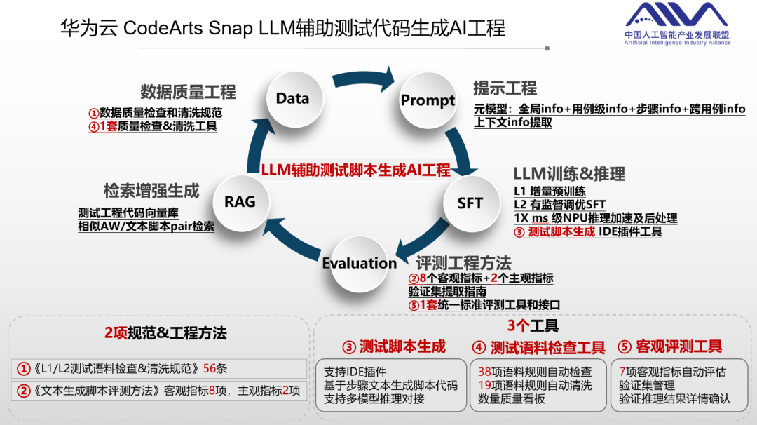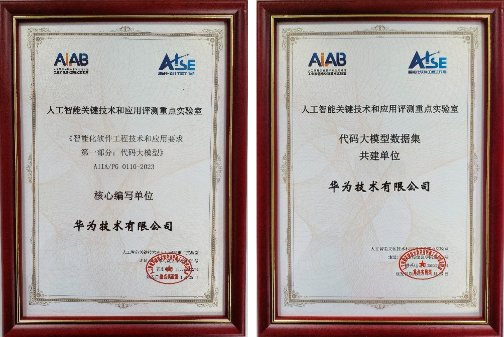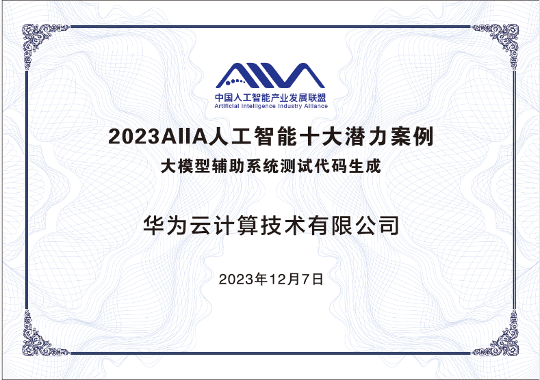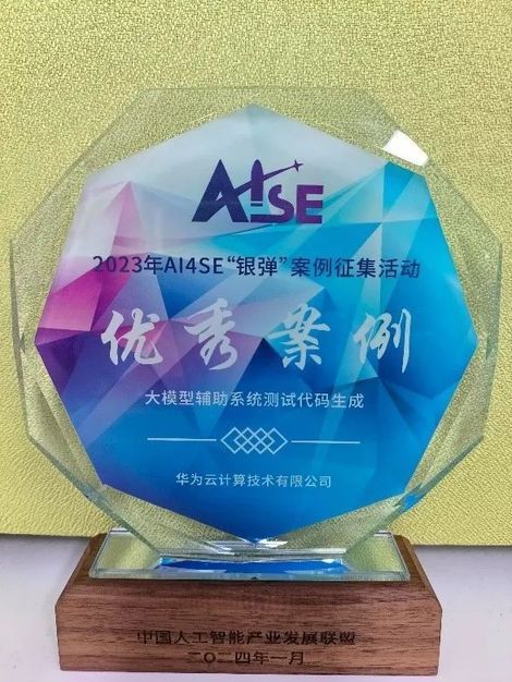 2024 年 1 月 25 日,中国人工智能产业发展联盟智能化软件工程工作组(AI for Software Engineering,下文简称 AI4SE)在京召开首届“AI4SE 创新巡航”活动。在活动上,华为云大模型辅助系统测试代码生成荣获“2023AI4SE 银弹优秀案例”,并获得人工智能关键技术和应用评测重点实验室“代码大模型数据集共建单位”与“《智能化软件工程技术和应用要求 第一部分:代码大模型》核心编写单位”荣誉证书。
