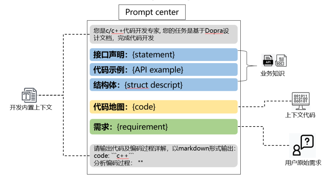 在 IDE 项目文件中检索跨文件信息;在向量数据库中检索 API 接口说明、工程规范信息。根据 prompt 模板,将用户的需求描述与上述检索信息拼接成完整的 prompt,输入给大模型。