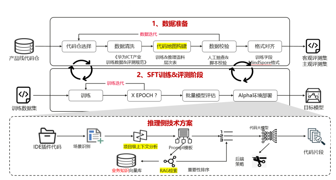 首先,我们对各产品线的代码仓库进行评估,挑选出高质量的代码仓库。接着,根据华为云 PaaS 研发项目组制定的五项数据标注和清洗规范对代码进行清洗。在《训练 &推理语料层次表》的基础上,构建代码地图,并通过人工抽查与脚本校验自动化执行。最后,对训练数据进行格式统一,生成训练集、客观评测集和主观评测集。