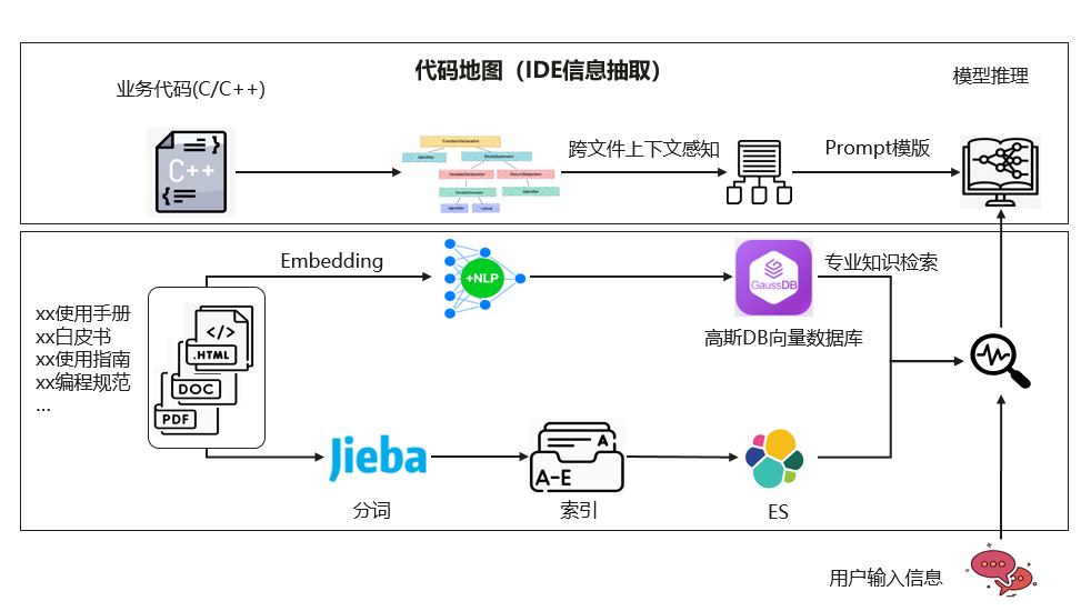 自动化信息抽取同时解决了知识增量刷新机制的问题:通过工程化方法,克服了 LLM 知识更新的难题。将业务领域知识、华为编程框架、工程规范等模型所不具备的能力与模型相协同。在项目级上下文感知方面,基于项目静态结构、仓库演化历史以及开发者实时行为,精确检索与代码生成任务最相关的项目上下文。
