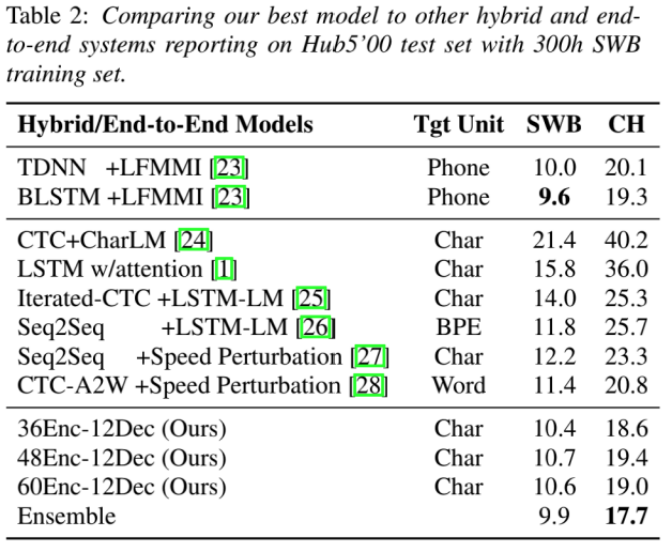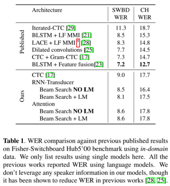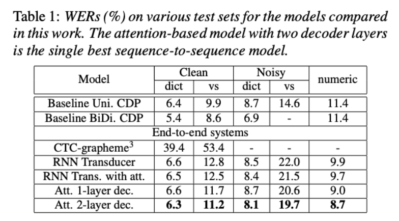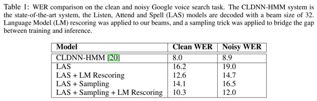 其中,CLDNN-HMM是DNN/HMM混合模型,LM Rescoring是加上语言模型,Sampling是训练中以一定概率从前面预测结果采样作为后续预测输入。从中可以看出,各种情况下性能都差于混合模型。
