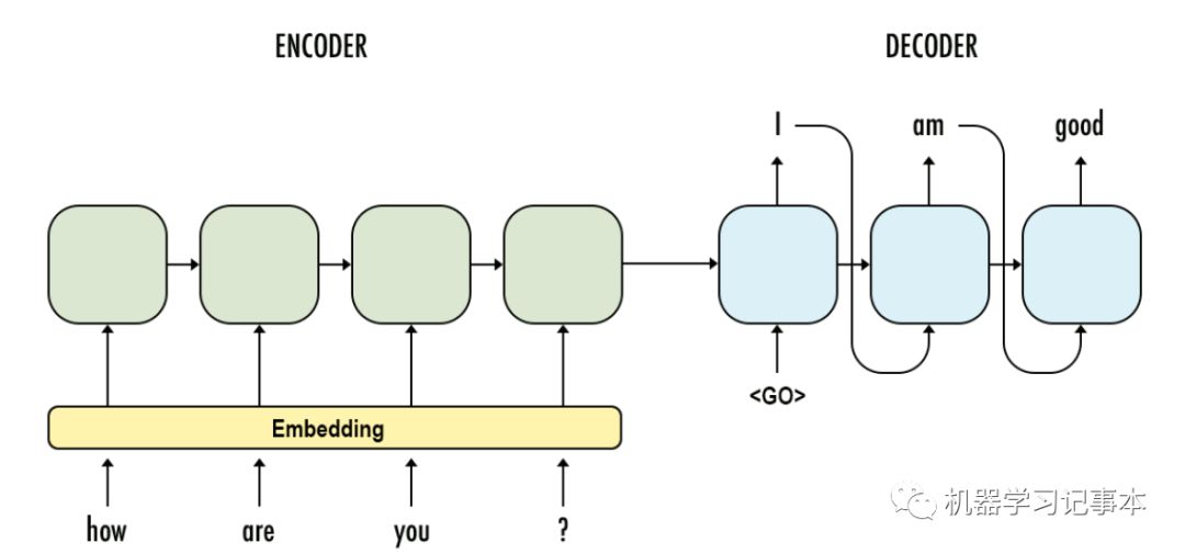 左边蓝色部分是Encoder,通过LSTM实现,右边红色部分是Decoder,通过另个一个LSTM实现。Encoder的输出作为Decoder最开始的输入,不断预测出一个一个的单词。