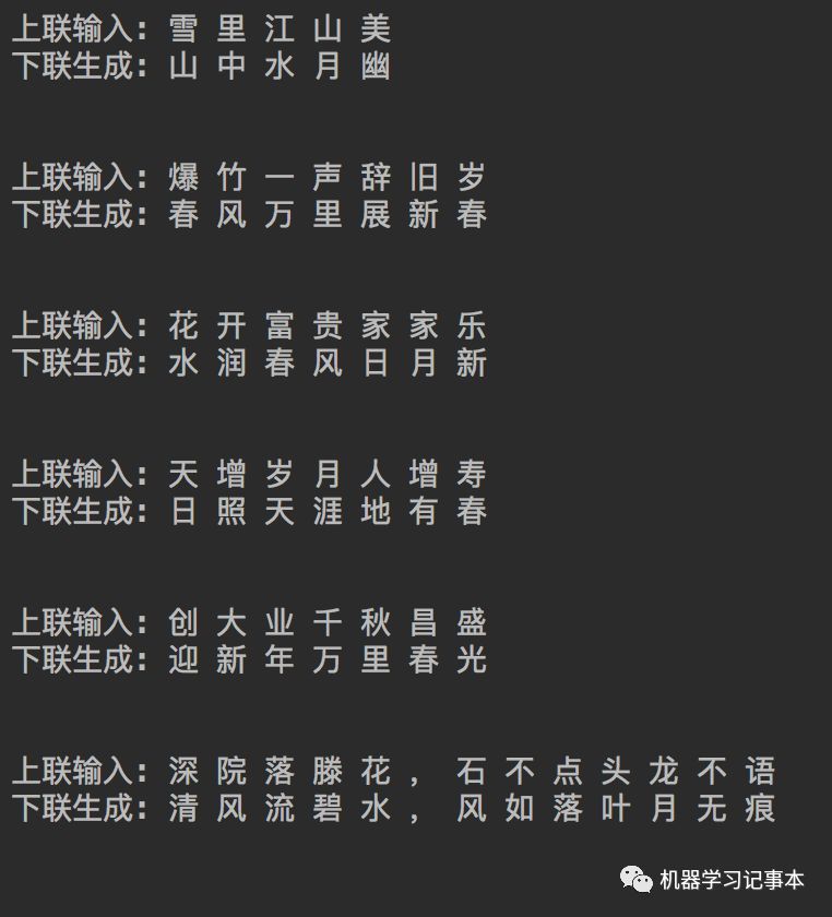 有人可能会问横批呢,由于训练数据中只有上下联没有横批,所以模型没法生成横批。要是有训练数据,道理也是一样的,把横批当成标签训练就是。