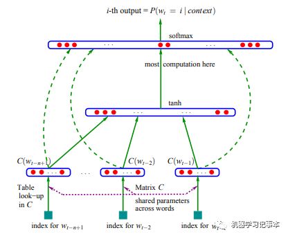 神经网络语言模型属于在连续空间计算预测的模型。2003年Bengoi等人在ANeural Probabilistic Language Model论文中提出了前馈神经概率语言模型,并开始使用词向量,其模型结构如下: