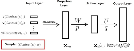 对语料库中任意词w,其前n-1个词记为Context(w),这样(Context(w),w)就是一个训练样本,其中Context(w)为输入,w为标签。Context(w)中每个词有一个初始向量,共n-1个,所有n-1个向量前后连接起来组成一个新的向量,就是投影层的x。