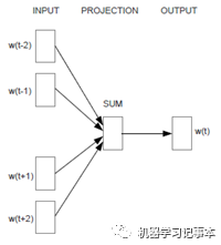 该模型简称CBOW模型,其根据上下文预测中心词。其简化模型如下图: