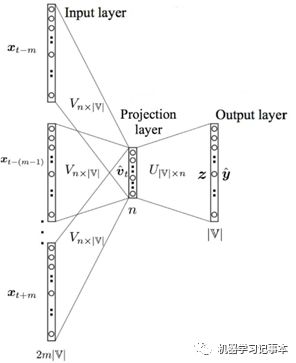 3)投影层:n 个节点,上下文2m 个词的one-hot 表矩阵V相乘后得到的词向量求和再求平均,即 V*x 求和再求平均;