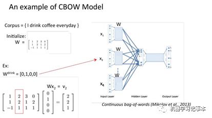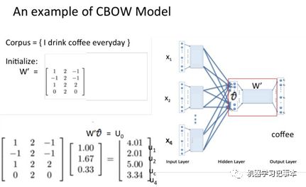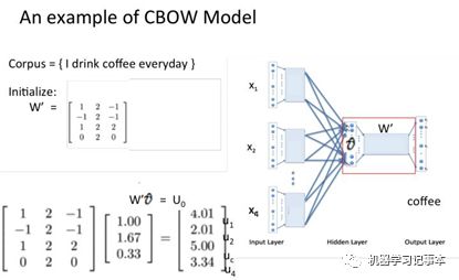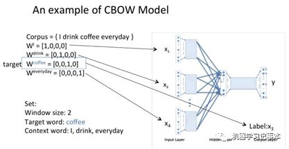 假设我们现在的Corpus是这一个简单的只有四个单词的document:{I drink coffee everyday}我们选coffee作为中心词,window size设为2也就是说,我们要根据单词"I","drink"和"everyday"来预测一个单词,并且我们希望这个单词是coffee。