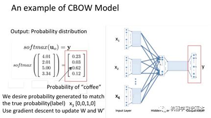 4) 输出层: |V|个节点,通过softmax,第 i 个节点代表从2m个词预测出中心词为第i个词的概率。