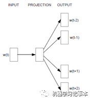 Skip-gram模型思路和CBOW模型相反,即根据中心词预测上下文词。简化模型图如下: