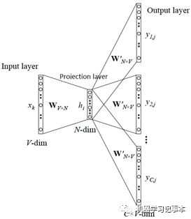 用下图能更容易说明一些,整个网络分为4层,输入层、投影层、隐藏层和输出层。