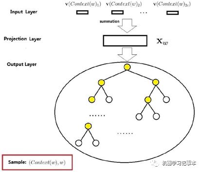 其主要思想是用Huffman树替代输出层的softmax,用于CBOW时模型如下图: