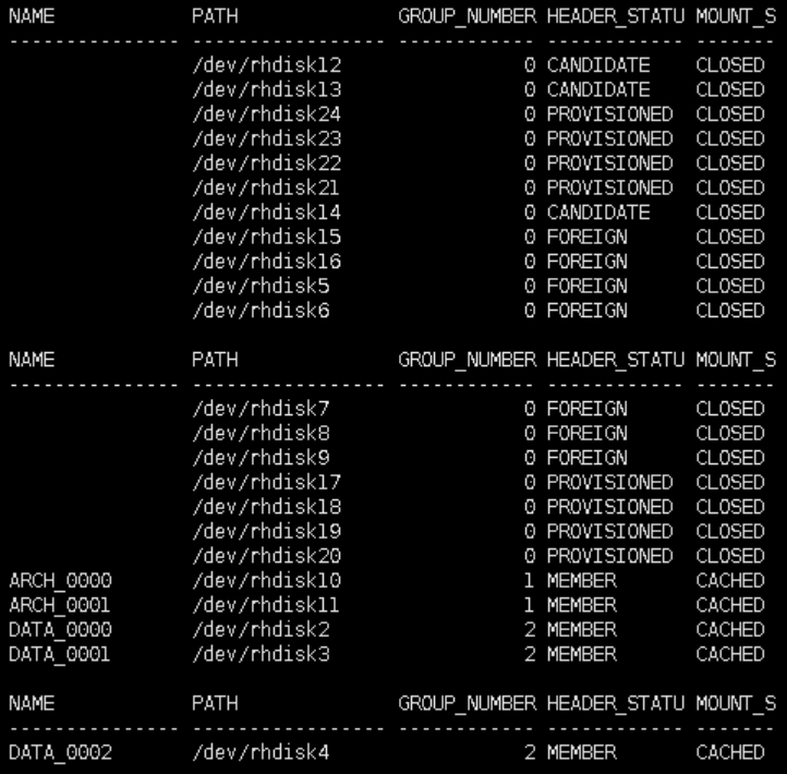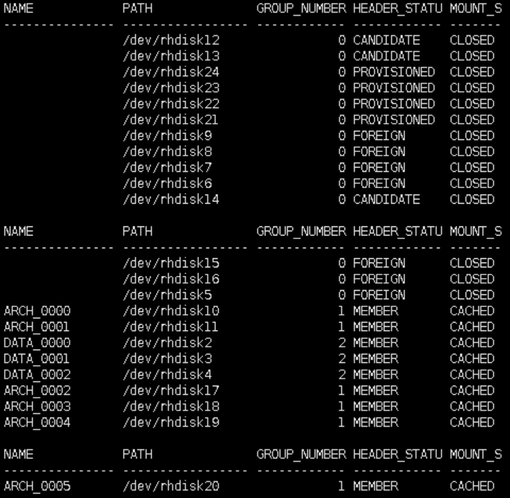 SQL>select name,path,GROUP_NUMBER,HEADER_STATUS,MOUNT_STATUS from v$asm_disk;