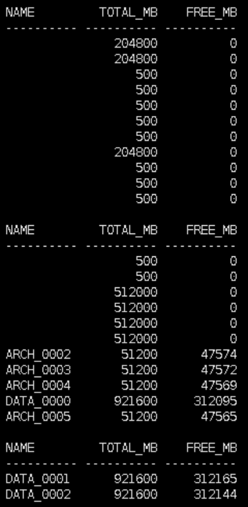 SQL>select name,total_mb,free_mb from v$asm_disk;