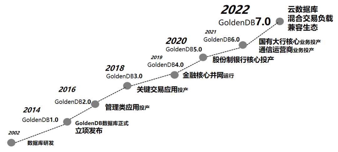 中兴通讯在文件数据库、内存数据库和分布式关系型数据库有多年研发积累,于2014年正式立项金篆GoldenDB分布式数据库并发布第一个版本,面向金融应用场景,历经近10年版本迭代,目前已经发展到金篆GoldenDB 7.0,推出云数据库、混合负载和兼容生态等重要特性。