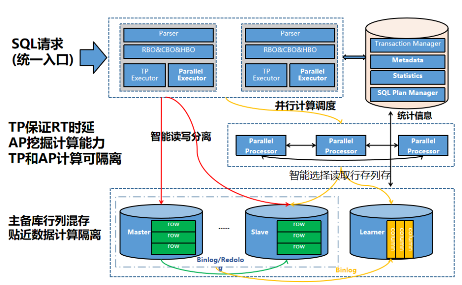 金篆GoldenDB自主研发分布式SQL引擎,重点突破分布式并行执行框架、复杂查询改写、行列混合存储、向量化等关键技术,实现一套引擎同时支撑在线交易和在线分析,避免在传统架构中在线与离线数据库之间大量的数据交互。通过行列存储、冷热数据分级存储、向量计算、LLVM, CPU指令集优化、Online Schema Change、B+Tree索引无锁优化等技术,大幅提升面向复杂查询场景的处理能力。
