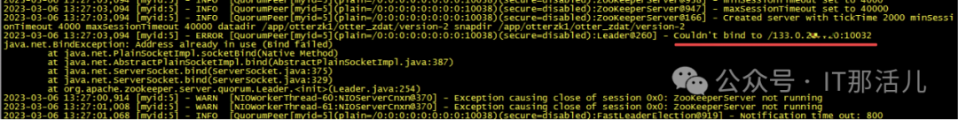 发现10032是该zk的选举端口,进一步在服务器中查看10032,发现被其他服务占用了。