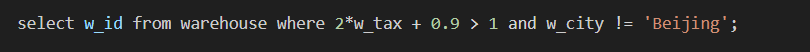 该SQL语句中有投影:w_id, 也有过滤条件:2*w_tax+0.9>1andw_city!='Beijing' 两个表达式需要执行,对于过滤的表达式树如下: