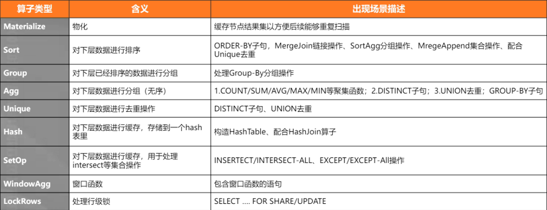 物化算子一般指算法要求,在做算子逻辑处理的时候,要求把下层的数据进行缓存处理,因为对于下层算子返回的数据量不可提前预知, 因此需要在算法上考虑数据无法全部放置到内存的情况 关键特征:需要扫描所有数据之后才返回 。
